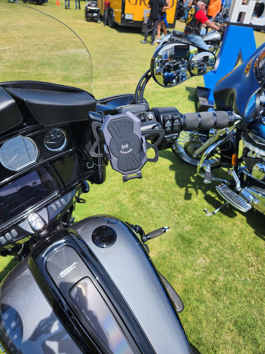 Metal Inductive Charging Phone Mount with 1 1/2" handlebar bracket adapter, Quick Disconnect Power Cable, Vibration Damping